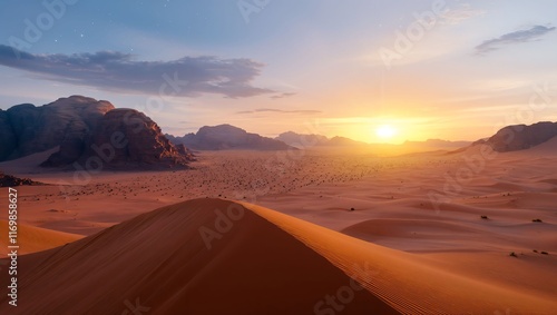 © akarawit, Naklejka premium A Striking Dune at Dawn: The Majestic Desert Landscape Bathed in Golden Light Invites Serenity and Contemplation Amidst Nature's Timeless Beauty and Splendor.