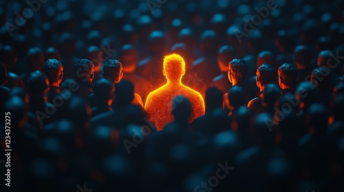 © BG_Illustrations, Obraz premium A striking glowing figure surrounded by a shadowy crowd, symbolizing individuality, leadership, and uniqueness.