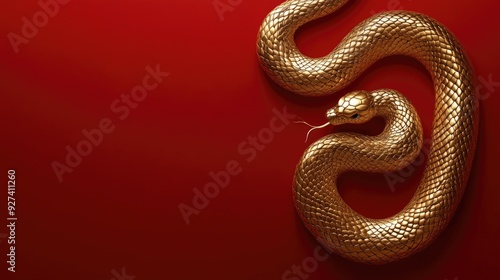 © 69, Obraz premium A striking gold snake coiled elegantly on a vibrant red background, symbolizing the Chinese New Year of the Snake 2025.