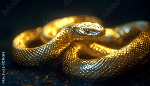 Fototapeta premium A striking golden snake glimmers under dramatic lighting, showcasing its...
