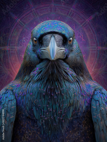 © valeo5, Obraz premium A striking, high-detail portrait of a raven's head and chest, showcasing glossy, iridescent blue/purple feathers. The background is a vibrant, psychedelic, and mystical purple and pink mandala pattern