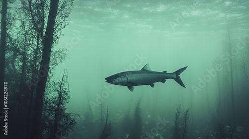 Fototapeta premium A striking image of a barracuda swimming gracefully through a misty forest,...