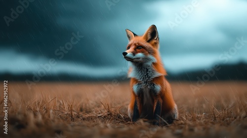© Novcicrelax, Fototapeta premium A striking image of a graceful fox sitting in a rain-kissed field, a representation of wilderness, solitude, and the beauty of nature in a dramatic atmospheric setting.