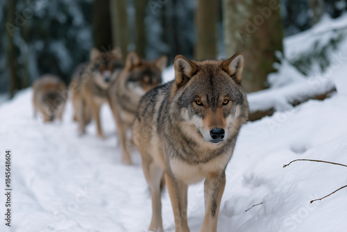 Fototapeta premium A striking image of a pack of wolves moving through a snowy forest,...