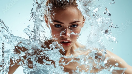 Obraz premium A striking image of a woman forcefully emerging from splashing water,...