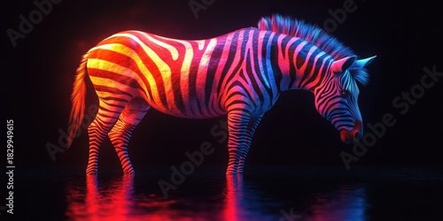 Naklejka premium A striking image of a zebra immersed in water, its distinctive black and white stripes dramatically illuminated with vibrant red and blue hues, creating a surreal and captivating effect.