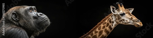 Fototapeta premium A striking image showcasing a gorilla and a giraffe in profile against a dark...