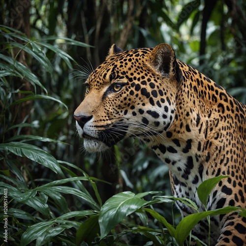 © Tariq, Naklejka premium A striking jaguar with golden fur and dark spots stalking through the jungle.