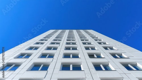 © A4719, Obraz premium A striking low angle shot captures a tall building against a vibrant clear blue sky. The building's repetitive window pattern and stark white facade