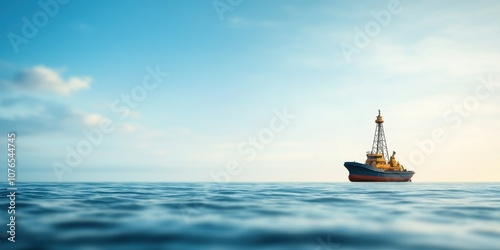 © kiimoshi, Obraz premium A striking oil rig stands majestically on calm ocean waters under a bright sky.