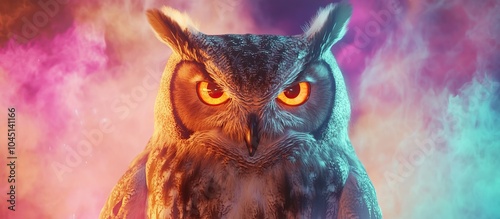 © isrofiyah, Obraz premium A striking owl with glowing orange eyes against a colorful background.