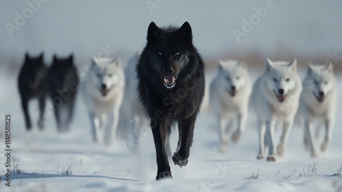 Naklejka premium A striking pack of wolves in winter, with an alpha black wolf leading the...
