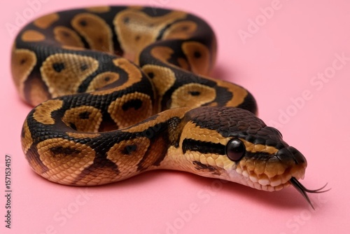 Obraz premium A striking Papuan python lies coiled on a pink backdrop, its vibrant pattern...