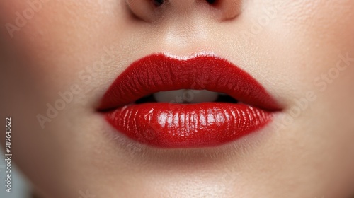 Obraz premium A striking photograph featuring glossy red lips parted slightly to reveal...