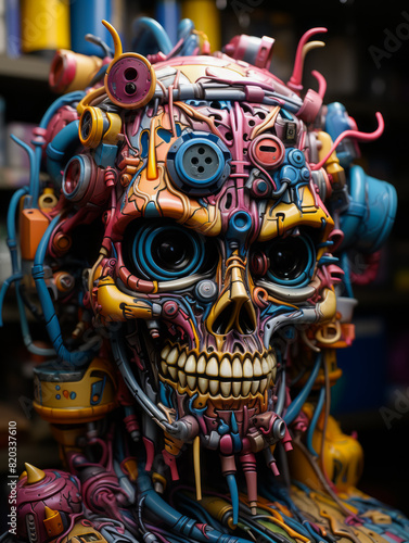 Fototapeta premium A striking piece of art featuring a vibrant skull crafted from an assortment of buttons and wires, epitomizing creativity and innovation
