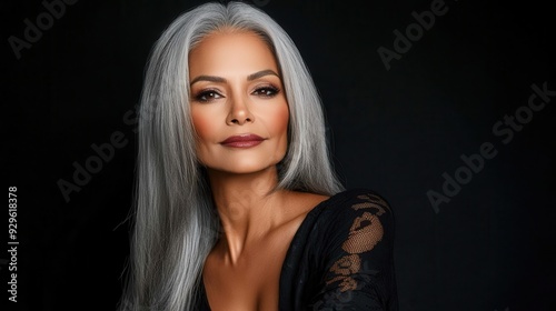 © Suphot, Fototapeta premium A striking portrait of a confident woman with silver hair, exuding elegance and beauty against a dark backdrop.