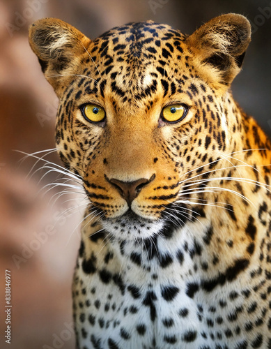Fototapeta premium A striking portrait of a leopard with a piercing yellow eye highlighting its...