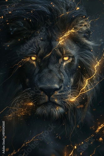 Naklejka premium A striking portrait of a lion illuminated by golden sparks, symbolizing...
