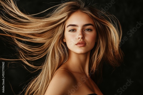 © Oulaphone, Obraz premium A striking portrait of a woman with flowing hair, exuding confidence and beauty against a dark background.