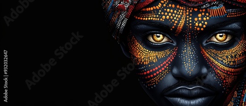 Naklejka premium A striking portrait showcasing intricate face paint and captivating eyes, celebrating cultural beauty and artistic expression.