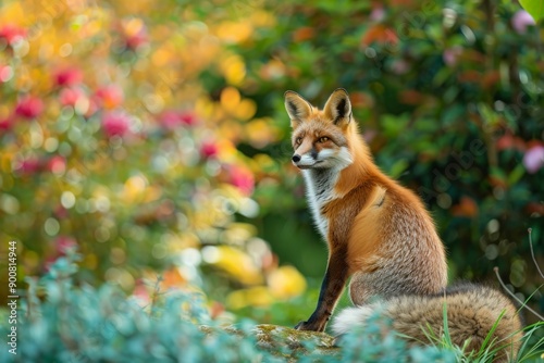 Naklejka premium A striking red fox sits gracefully amidst a vibrant and colorful autumn...