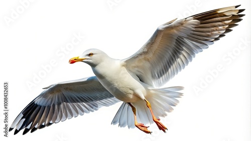 Fototapeta premium A striking seagull soars gracefully against a pristine white backdrop,...