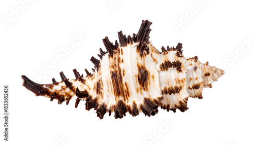 Fototapeta premium A striking seashell with sharp brown spikes contrasting its white surface,...
