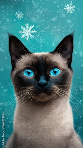 Fototapeta premium A striking Siamese cat with bright blue eyes, set against a teal backdrop adorned with snowflakes, capturing a wintery, enchanting vibe.