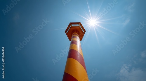 Fototapeta premium A striking striped tower ascends towards a radiant sun and a vast clear blue...