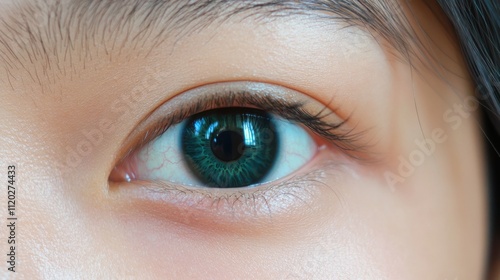 © Thanaporn, Obraz premium A striking teal eye of a Southeast Asian individual, glowing with radiant clarity and soft gradients