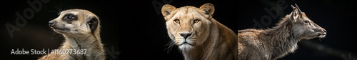 Fototapeta premium A striking trio of a meerkat, lioness, and goat, capturing their unique characteristics and expressions.