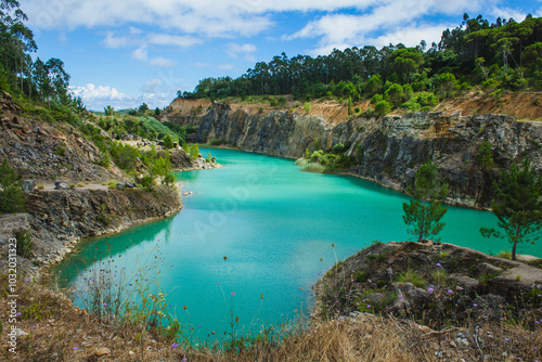 Fototapeta premium A striking turquoise lake surrounded by rocky cliffs and lush vegetation