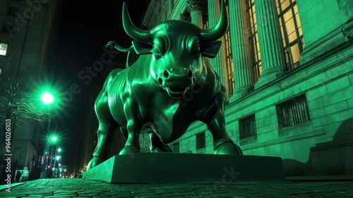 Fototapeta premium A striking view of a green illuminated bull statue, symbolizing strength and...