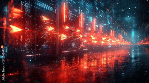 © Rinowz, Fototapeta premium A striking visual of multi-colored arrows launching from the ground, flying in unison, and sticking into a high-tech wall screen, perfectly aligned and spaced