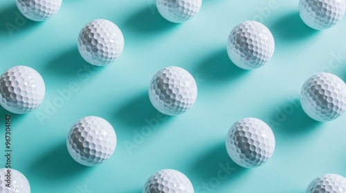 © chutikan, Fototapeta premium A striking white golf ball is set against a pastel blue background.