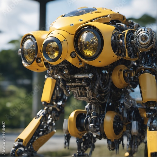 Fototapeta premium A striking yellow robot with intricate mechanical details, showcasing...