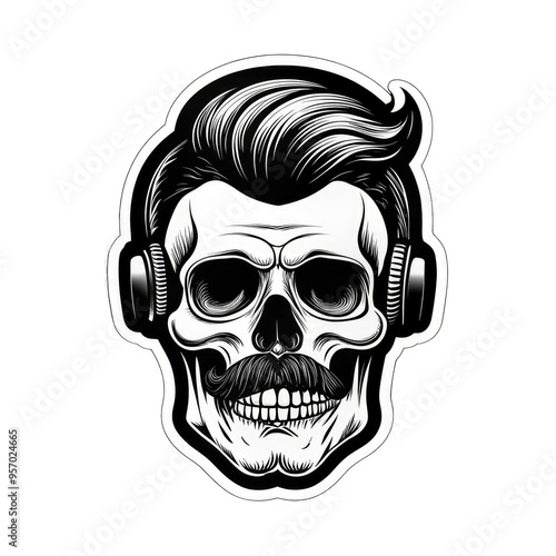 © andreiko, Fototapeta premium A strikingly detailed pop art sticker of a DJ skull adorned with a handlebar mustache and a stylish posh undercut haircut against a solid black background. Intricate Pop Art Sticker of DJ Skull with