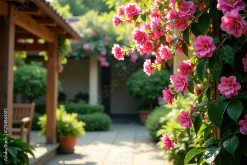 © dadtophoto, Fototapeta premium A string of tiny pink blooms cascades down a wooden trellis in a sunlit courtyard, wooden, garden, trellis