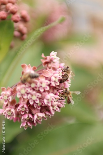 © Katerina, Fototapeta premium a striped bee sucks nectar from a blooming plant
