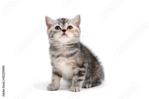 Obraz premium a striped purebred kitten sits and looks at the top on a white background