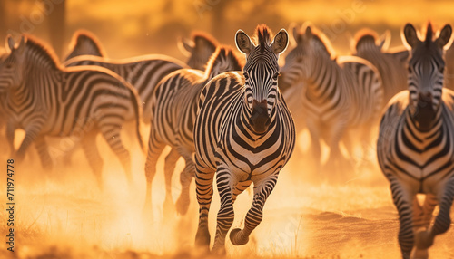 © Jemastock, Fototapeta premium A striped zebra stands in the African wilderness, surrounded by beauty generated by AI