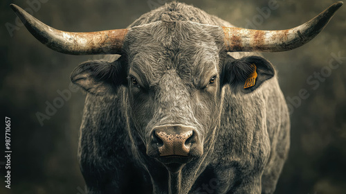Naklejka premium A strong and mighty gray bull with impressive horns glaring directly at the...