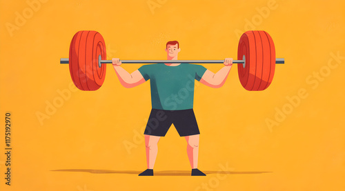 © Metanee, Obraz premium A strong man lifts a heavy barbell against a bright yellow background, showcasing fitness and strength training.