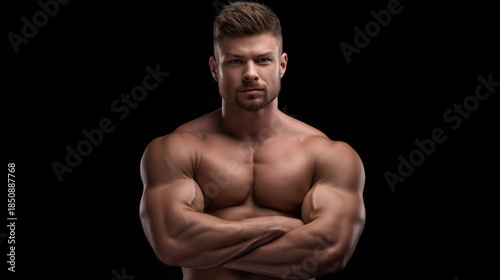 Fototapeta premium A strong man with a muscular build strikes a confident pose, displaying his well-defined muscles under dramatic lighting