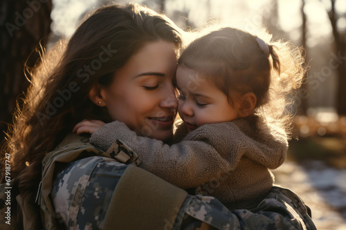 Obraz premium A strong soldier woman. A soldier mother returning home and embracing her child.