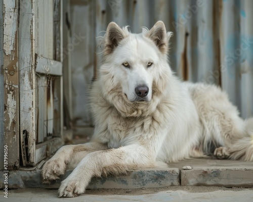 © VolumeThings, Obraz premium A strong white Central Asian Shepherd dog rests in an enclosed area