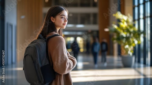 Fototapeta premium A student in casual attire stands in a contemporary school hallway, looking...