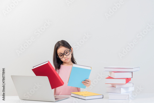 © Tanatpong, Naklejka premium a student on the table and laptop among a large number of books