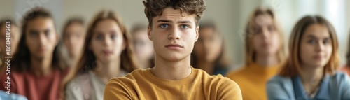 © Artinun, Obraz premium A student watching their friend win a prize, showing signs of jealousy and envy, with a look of dissatisfaction and crossed arms, illustrating the emotion of jealousy