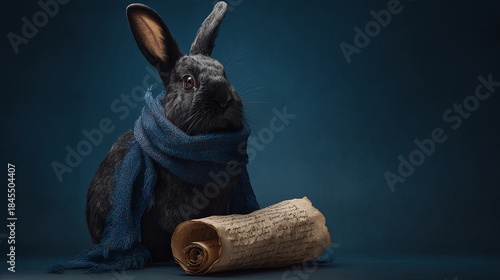 © Thiago, Obraz premium A studio shot of a black rabbit wearing a blue scarf and holding a scroll. The rabbit looks regal and elegant.